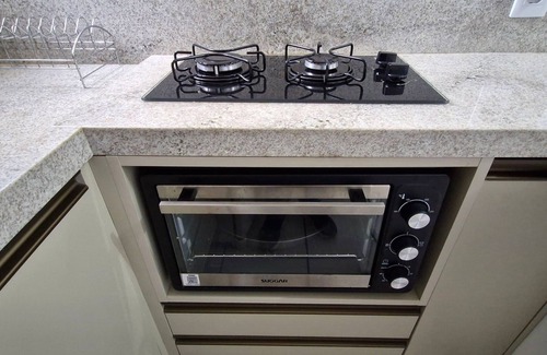 - Kitchen with counter and 2 high stools, refrigerator, 2-burner cooktop, electric oven, water filter, sandwich maker, microwave, blender, electric coffee maker, pots, couscous maker, cutlery, plates, glasses, cups.