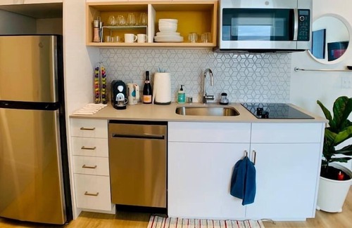Corner unit studio with plenty of natural light and premium amenities for a very comfortable quick stay. The studio is furnished & decorated to maximize comfort & stocked with premium linens, bath towels & those little items you might have forgotten to pack before a trip. A kitchen fully stocked with all the necessities to prepare your own meal, a huge shower to wash away the sweat from a night out at nearby local venues, and a comfortable bed to recover from the excitement you are sure to experience during your stay. 1 Gig Fiber internet connection.