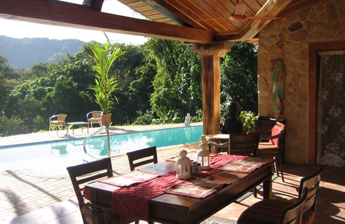 Relax and enjoy breathtaking views over the valley and the mountains beyond from the patio and pool. Watch for flocks of budgies, and the sunrise and sunset passage of Scarlet Macaws. Listen for Toucans, and watch Social Flycatchers and Mourning Doves come to bathe. Make your unforgettable vacation in this piece of Costa Rican paradise.