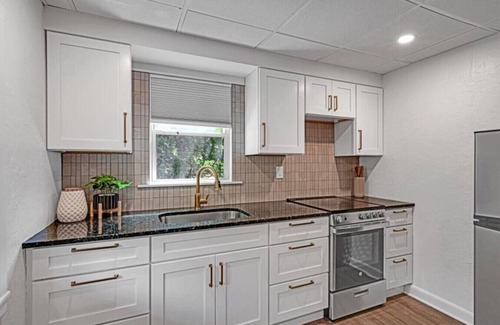 The kitchen has all new appliances, including fridge, oven, microwave, and is fully stocked with kitchen essentials.
