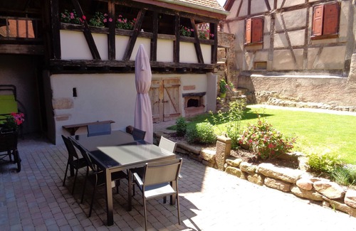 Located in the heart of Alsace, on the wine route halfway between Colmar and Strasbourg, near the main tourist sites, Dambach-la-ville is a charming medieval village nestled in the vineyard. The cottage, located on the ground floor of an old barn completely renovated, gives direct access to a beautiful paved terrace facing west. With an area of 80m2, it is equipped with 2 bedrooms that can accommodate a total of 5 people. Equipment: fitted kitchen, dishwasher, washing machine, barbecue, garden furniture, television. Services included: wifi, sheets, towels, cleaning. Label Gites de France 4 stars.