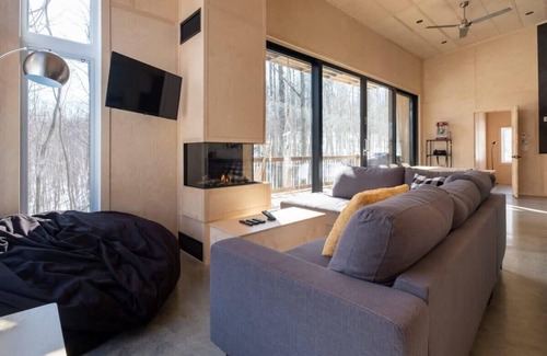This cabin, on the backside of Mont-Orford Park, is situated on the immense 1000-acre Vertendre forest playground. This protected, private territory offers 2 lakes and a mountain where you can enjoy a wide range of outdoor activities right on the site. A perfect balance between ecology, innovation, and comfort.