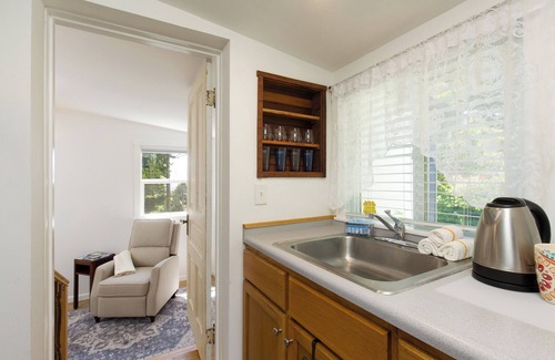 Inside, you'll find a thoughtfully curated space featuring a fully equipped kitchenette, a light-filled living area, and a restful bedroom perfect for couples or close friends. Every detail has been refreshed with care, creating a peaceful, storybook ambiance ideal for unwinding after a day of exploring. Enjoy access to the shared gardens and grounds, perfect for a picnic under the trees, or relax on your private front deck, complete with a privacy fence and lounge chairs ideal for soaking in the warm sun.