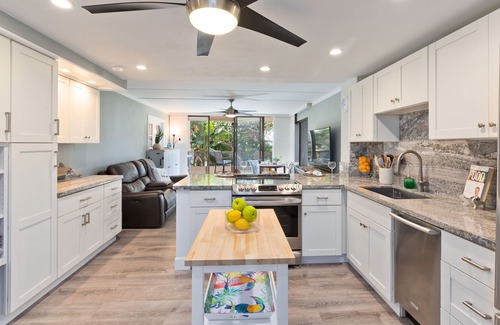 Enjoy ocean and garden views from this third floor, corner unit condo in Building C of Kona Pacific! Located in a prime location in the heart of Kailua Kona on the Big Island of Hawaii, this 1-bedroom, 2-bathroom condo has been completely remodeled. It also offers incredible features unlike many others in the complex. Enjoy an ocean view and cotton candy sunsets from the generous wrap-around lanai. Inside, take advantage of ocean breezes all day with windows on two sides and a window AC unit in the living room for extra comfort on hot days. Kona Pacific has a pool with a designated BBQ area to chef up an island inspired meal (only 1 bbq per unit at any time), beautiful landscaping, library room, one assigned parking space and elevator building access. The condo is furnished with a Cal King bed in main bedroom and a New portable Queen muphy bed thats available for extra guests situated in the living room.