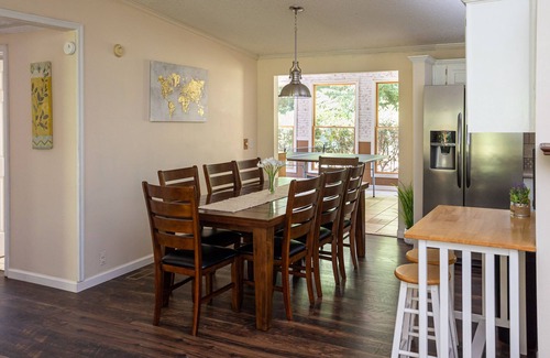 The house includes a spacious deck, outdoor firepit, hammock, covered bar area with Roku TV, coal grill, and a picnic table. On the cold nights, enjoy wood fireplace, ping pong, board games, and a dinner at a large dining table.