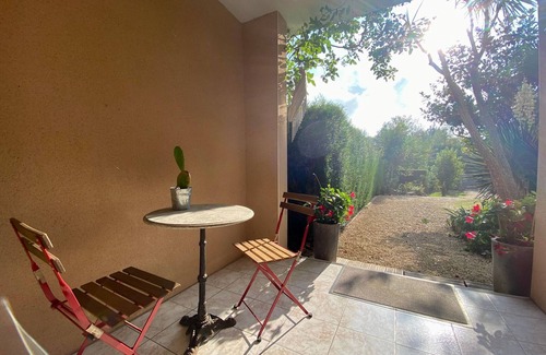 Charming enclosed and wooded garden of 250 m², with a wooden terrace and arbor. Secure private parking on the property.