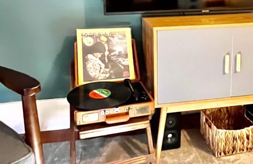 The living room/bedroom includes a queen bed, smart tv, record player and comfy seating.
