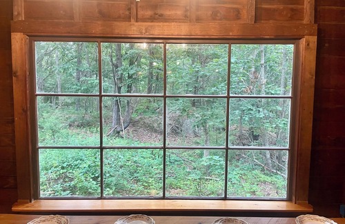The dining and living room are an open floor plan with another working fireplace. This great room has gleaming, shiny hard wood floors throughout. There is a 63-inch TV, games, and puzzles in the event of rain. Outside the back-double Dutch door, you will find a delightful covered porch for al fresco dining or an after-dinner drink. There is a 300-year-old, 15-foot-long Ashwood bench on the porch waiting for you to claim your seat, along with comfy and conventional outdoor furniture for dining and sitting. Look up and you will see an antique French chandelier hanging above the table. Please expect to see wild animals from your perch on the porch, including deer, turkey, and even the occasional bear!