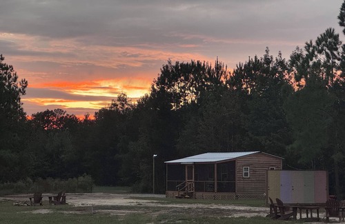 Take it easy at this unique and tranquil 320 sq. ft. cabin designed to enhance your elevated camping experience in Jewel’s Woods. With one queen bed and a queen pull out sofa, it’s a perfect spot for two. There’s a small back deck with a grill and outdoor dining on the shady side and a screened in porch in front to keep the bugs at bay. A kitchenette features a multi-function counter top oven, hot plate, coffee station, microwave and apartment sized fridge. A mini-split system offers your perfect temperature, and there's an instant hot water heater and clean county water. Come relax in our quaint, comfy cabin and explore 46 acres of peaceful nature and our 1-acre pond. Far from crowds and noise, yet just 8 minutes from a grocery store and just 30 miles to the coast. Fish, play games from our toy shed, paddle board, read, tree bathe, hike, relax. It's the perfect place to disconnect from the crazy world and reconnect with a loved one and with yourself. (Note that this is one of three units for rent in Jewel's Woods. Care has been taken to create private areas, but the pond, gazebo and lawn games could possibly be shared.