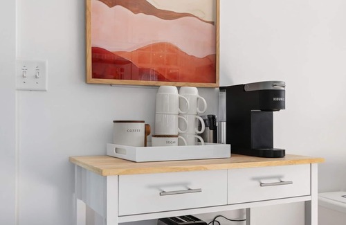 The kitchen, which is open to the living room, comes fully equipped with brand new appliances including an oven, stovetop, standard-sized refrigerator/freezer, microwave, coffee maker, as well as basic cookware. Beneath the beautiful butcherblock countertops are four bar stools. On the wall opposite the kitchen is a laundry station housing full-size washer and dryer units.