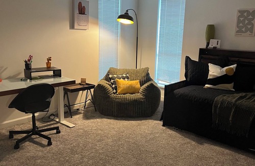 The open living room features vaulted ceilings, cozy seating, and a smart TV (with complimentary Netflix and YouTube on the guest profile). The office/lounge doubles as a workspace, hangout, or guest room — making it easy to balance work and relaxation during longer stays.