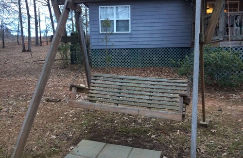 Lake front cabin with a beautiful view. A dock for jumping in, watching sunsets, or tying your fishing boat up to! Sleeps up to 10 ( counting 2 children in loft bed). Two bathrooms, a full kitchen and dining room, a fire pit, and a charcoal grill make this place perfect for enjoying the lake! We have the perfect spot to enjoy a cup of coffee in the morning while watching the fog drift off the lake! This place is a stress free zone!