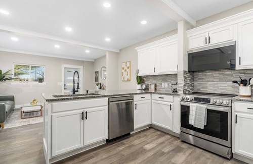 Kitchen: A fully equipped kitchen with granite countertops, stainless steel appliances, a coffee maker, and all the essentials for cooking.