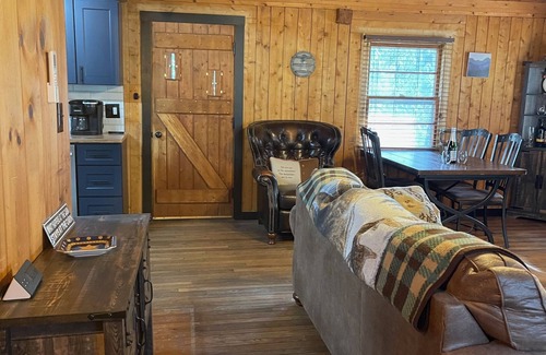 Take the perfect mountain vacation at this incredibly cozy, creekside log cabin in Maggie Valley. Perfect couples getaway, or a fun trip for a small group. Our cabin is very easy to access (close to everything in Maggie) yet you still feel tucked away in the woods. You’ll love the spacious, open living room and kitchen, the spa-like remodeled bathroom, and the comfy gas log fireplace that heats up the entire living room. Enjoy the year-round flowing creek and wintertime views from the covered back porch or relax in an adirondack chair by the creekside fire pit. Stocked with plenty of cooking utensils, blankets, towels and more – you'll have everything you need for a weekend getaway or a two week stay. We do have another cabin close-by if you have a larger group; contact us for more details if you may be interested in renting both.