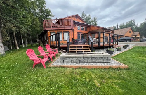 Beautiful Alaskan style home. Surrounded by trees on over a half acre. Large deck BBQ grill and fire pit available to enjoy the ambiance. This lovely four bedroom home sleeps eight comfortably. Upstairs master bedroom includes a sauna and private balcony with table and chairs. We are willing to accommodate a few more with notice of extra guests. There is over a half dozen parking spaces available for guests. We welcome parties/celebrations birthdays, etc but please ask to be considerate of quiet hours.