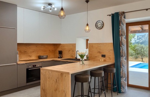 The modern Villa Bembic with private pool near Labin is the perfect choice for a holiday with your loved ones. The villa offers accommodation for up to 7 guests in 3 bedrooms. The outdoor area of the house consists of a private pool where you can refresh yourself from the summer heat or simply enjoy the sun rays on the sun loungers. There is also a garden where you can enjoy the activities offered by this villa - badminton, pikado or table tennis with your loved ones. Don't miss the opportunity to prepare Istrian delicacies on the barbecue in such a pleasant natural environment. From the terrace there is direct access to the ground floor of the house. A modern living room, a fully equipped kitchen and a dining area form an open-plan living space. A bedroom with 2 single beds with en-suite bathroom and a guest toilet complete this level. The staircase leads to the first floor, which consists of 2 comfortable bedrooms with double beds and en-suite bathrooms. The balcony offers a beautiful view of the marvellous landscape. Book Villa Bembic and secure yourself an unforgettable holiday in the Istrian region.Villa Bembic is located in Nedeina in the hinterland of Istria and is surrounded by the special features of this region: hilly landscape and untouched nature. This area invites you to enjoy and relax in nature, but also offers a range of possibilities such as hiking or cycling on well-known routes. Visiting wine cellars and tasting Istrian specialities such as truffles and prosciutto is a must - of course with a glass of the famous Istrian Malvazija on the way along the enchanting wine trails. Nearby are the towns of Labin and Rabac, known for their unique ateliers, where you can enjoy art at every turn. These towns have excellent beaches and restaurants and also offer activities such as: Tennis, golf, beach volleyball and water sports. The adrenaline parks and diving centre in Krnica Bay, located next to cycling and hiking trails, are a must for adrenaline lovers. The nearest beach, Draine in Plomin, is only a few minutes' drive away.