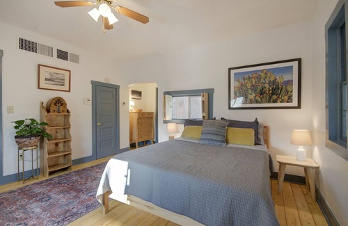 Kick back and relax in this quiet, stylish space. Our cozy home is on a large peaceful yard in a transiting neighborhood. Our newly renovated home sits on a tucked-away dead-end road. Enjoy the sunny rooms, plants, colorful tiles, and wood floors. Built in 1937, this space was loved by the original owner. We revived and freshened it up just for your private stay. Enjoy the yard with a fire ring and peaceful no-car walks along the South Valley's irrigation ditches. Monthly discounts.The front living room is full of natural light and a beautiful nature-loving view of the outside. The bedroom has custom-crafted shutters to close for deep sleeping on the comfortable bed with the full bathroom attached. The kitchen is complete for cooking meals. The back room has a dedicated workspace and a lovely view of the big trees in the backyard, as well as a washer-dryer. The fenced-in yard is all set to enjoy nature and roam around. The South Valley is a transitioning historically rich in agriculture part of the more extraordinary Albuquerque city. If you take a walk around you are sure to see small farming plots and farm animals. In the south valley, you will hear people speaking Spanish and enjoy culturally Mexican and New Mexican restaurants, shops, and bakeries.