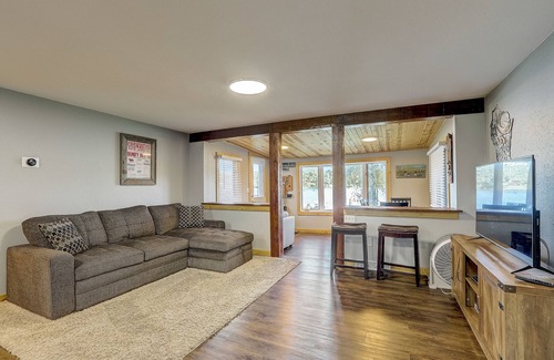 This 2-bedroom cabin features new appliances, a pull-out couch, a cozy, pull-out recliner, an outdoor fire-pit, a gas-grill, and private lake access.