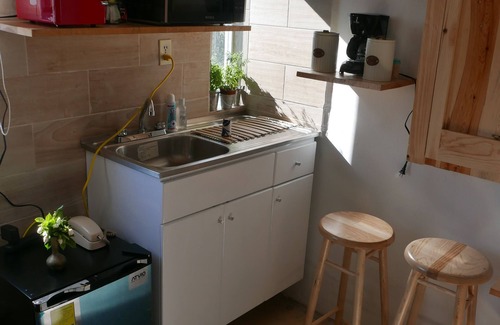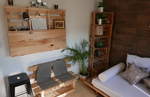 This small and versatile studio is equipped with a small kitchenette, fold out dining table, fold out mini bar and even a small designated work-space desk (also folds out) equipped with a fast wifi internet connection. There is also an adjacent "urban mini-rooftop lounge" area where one can lounge while enjoying the sunset or full moon nights (see images).