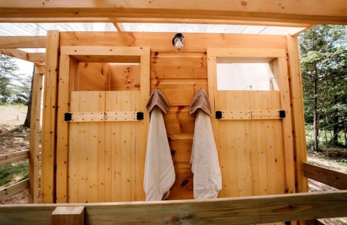This is a glamping site with an A-Frame and a detached full bathroom unit. Enjoy the luxuries of home with a hot shower, facilities and a cozy bed while camping and embracing nature.
