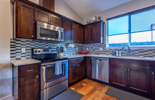 Gourmet Kitchen: Prepare delicious meals in the well-equipped kitchen adorned with a stylish glass tile backsplash, quartz countertops, and stainless-steel appliances.