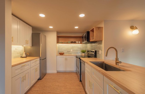 (Also listed on Furnished Finder) Welcome to this recently updated, stylish and cozy lower unit with a separate entrance in a duplex house. The unit enjoys plenty of daylight through South facing windows. Open floor plan featuring a brand new full Kitchen with all new appliances, dining and living areas. Separate bedroom with Queen size bed, bathroom and laundry room. Private use of the gravel patio and seating area. Only an 8 minute walk to the Othello Light Rail, Safeway and many shops and restaurants. The apartment features new appliances, soft cork floors, new A/C and heating and a fully equipped kitchen. Lovely morning and midday sunlight, and a private backyard patio. Full bathroom with a shower. Designed and owned by two architects. Located on a quiet residential street in Southeast Seattle, the property includes one duplex house and a large yard. The front yard and upper deck is reserved for the upper long-term tenant, and the lower unit has access to the back gravel patio and shared use of the lawn beyond. The yard is un-fenced so is not suitable for pets. There is a garage at the rear of the lot for the owner's use. Guests have access to street parking, which is free and readily available in front. The apartment is a quick 8 minute walk from Othello Light Rail Station, and close to several buses (#7, #50 etc). Beautiful 7 acre Othello Park is only a 4 minute walk, and features walking paths, picnic tables and a view of Mt. Rainier. Take the light rail, bus or drive to nearby Columbia City for additional shops, restaurants and the Co-op market. Please be aware there are several steps (with handrail) down to main entrance. Once inside, the unit is all on one level.
