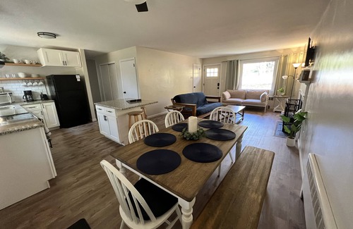 900+ sq. ft. 3 bedrooms (2 kings, 1 full), a small pullout couch, 1 bathroom with a shower, an enclosed back porch for relaxing, and a spacious backyard. Easily accessible located on main road with only 2 steps to enter the home and everything is on the main floor - laundry is in basement(stairs). Kitchen is stocked with pots, pans, utensils. Living room has reading materials. Bedrooms offer sound machines and window air units in the spring / summer. Backyard has a fire pit.