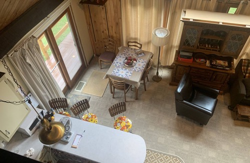 This rustic A-Frame located in the mountains of Pennsylvania is a two story, 3 bedroom/1 bath with a wrap around porch. It has a fully equipped kitchen with bar stool seating for 3 and kitchen table that seats 4. A cozy living room with working fireplace, flat screen TV to connect to your favorite streaming accounts such as Netflix and Hulu, and a VCR. There are also board games and free Wifi provided.