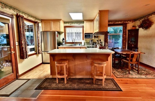 Step outside to a serene outdoor haven where a large covered deck overlooks a sprawling lawn that slopes gently toward the river. Enjoy alfresco dining with the propane BBQ, unwind in the exclusive hot tub on the side deck, or gather around your private fire pit for a cozy evening. The spacious yard is perfect for play and relaxation, and with an additional small fenced area. This home is pet-friendly for travel convenience- for a small fee. Whether you`re planning a family getaway, a romantic escape, or a fun trip with friends, Cedarbreeze offers the ultimate Pacific Northwest experience.