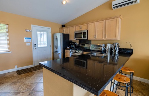 The guest house is equipped with an air-conditioned, uncommon for vacation rentals in the area, and full-size shower-tub. The property also features a fully equipped kitchen (including gas stove with electric oven, rice cooker, blender, air fryer, toaster, coffee maker, washer and dryer, cooking utensils, drinkable filtered water system, etc), a queen size pull out sofa bed, house phone, high-speed internet, and a 50” LCD High Definition TV with Hulu live TV, Hulu on demand, ESPN, Disney+, Netflix, and Amazon Prime. The living room TV is also connected to a High Definition Surround Sound System, BlueRay player, and a Nintendo Wii Console. The 32” LCD TV in the bedroom is equipped with Hulu live TV, Hulu on demand, ESPN, Disney+, Netflix, and Amazon Prime. The guest house is also equipped with smart locks, smart smoke/carbon monoxide detector, fire extinguish, baby proof outlet covers (available when needed), and recycling station. Finally, for guest traveling with babies and infants, we offer a clean and extremely well maintained Pack-N-Play and high chair.