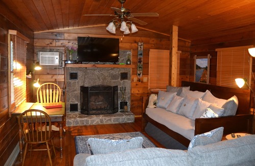 Inside our clean and well-maintained home is everything you'll need for a most pleasant stay. You'll love the stone fireplace with gas logs, the vaulted ceiling, comfortable living room with satellite TV, high speed internet, and DVD Player with HD-TV. The bedroom too has a large flat-screen TV. And on the upper level are two sofas, one of which becomes a comfortable trundle bed for 1-2 more guests.