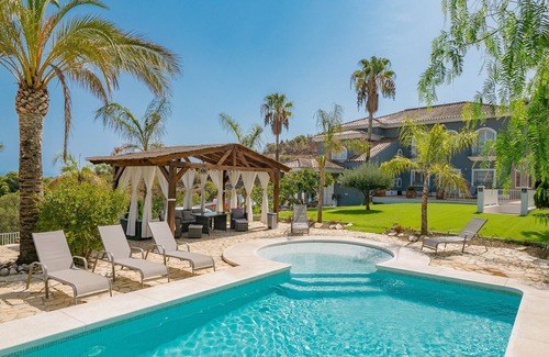 Charming holiday villa with private pool and spacious areas in Coín, Málaga, ideal for groups and families seeking comfort and nature. Hello! We are CUBO'S HOLIDAY HOMES, specialised in holiday accommodations since 2005.This spectacular villa in Coín offers an ideal space for groups of up to 10 people, with 5 bedrooms and 380 m² of modern and cosy comfort. Its strategic location allows you to enjoy both rural tranquillity and an excellent connection with supermarkets, restaurants and nearby tourist attractions such as beaches, natural parks and golf courses. Holiday accommodation with swimming pool in CoínThe exterior is a true oasis: private pool surrounded by palm trees, well-maintained garden, 32 m² terrace with outdoor dining furniture and a perfect barbecue area for gatherings and unforgettable moments. From the covered porch, you can enjoy relaxing views and evenings with family or friends. The interior stands out for its modern and welcoming style. The entrance is decorated with contemporary art and a zen garden that provides serenity. The spacious living room with fireplace and television with internet connection creates a perfect atmosphere for relaxing or entertainment nights. The American kitchen is fully equipped with modern appliances: refrigerator, microwave, oven, dishwasher, coffee maker, toaster and more, ensuring comfort and functionality to prepare any meal. The villa has a children's bedroom located near the social areas, ideal for keeping the little ones safe and close to the family. The main bedroom is a resting refuge with a private terrace, vintage chaise longue and en-suite bathroom with rain effect shower, independent bathtub and dressing room. Another bedroom also has an en-suite bathroom and bathtub, while the remaining bedrooms offer double or single beds, adapting to different needs. The house has heating by heat pump and air conditioning throughout the accommodation, guaranteeing comfort in any season. In addition, it has a garage, washing machine, dryer, and three televisions so that nothing is missing during your stay. The villa is located in an ideal environment for families and children, with easy access to supermarkets such as Aldi, Lidl and Mercadona, and just a few minutes from Coín and other nearby cities such as Marbella, Fuengirola and Málaga. It is also close to water parks, golf courses and the AVE María Zambrano train station, facilitating mobility and leisure. Do not hesitate to book your stay in this wonderful villa where you can hire cleaning during your stay and a private chef service for an even more exclusive experience. Come and enjoy an unforgettable getaway! As we also do in all other properties of our CUBO'S HOLIDAY HOMES brand, we provide all our accommodations with towel and sheet sets. We have cots and high chairs available upon request for babies from 0 to 2 years old. And all of this, absolutely FREE. Likewise, guests of CUBO'S HOLIDAY HOMES can enjoy EARLY CHECK-IN and LATE CHECK-OUT upon request, provided that the booking calendar and scheduled cleanings allow it. Other notable aspects CUBO'S HOLIDAY HOMES welcomes you!. We are a short stay management agency that offers carefully selected properties. The company was founded in 2005 with the mission of offering a quality alternative. The ratings of our guests in all our accommodations endorse us. You can check it on our profile.Moreover, CUBO'S HOLIDAY HOMES offers a blog with recommendations of the area, places to visit, restaurants and special dates. Do not hesitate to send us your comments (recommendations, requests, etc.). We will do our best to guarantee your safety and peace of mind. Booking Conditions Mandatory deposit before entry (refundable 48 hours after review). Parties and noise are not allowed during rest hours. It is recommended to take out travel insurance in case of water restrictions decreed by the authorities. IMPORTANT: Arrivals from 9:00 PM onwards involve an additional cost that must be paid upon entry.CUBO'S HOLIDAY HOMES is an online marketing platform for tourist accommodations. Through this platform, owners of establishments duly registered in the corresponding tourism registry of their autonomous community promote and manage the booking of their accommodations. CUBO'S HOLIDAY HOMES does not act in any case as owner, manager, operator, or direct responsible for any of the accommodations offered on the platform. Its function is exclusively limited to facilitating contact between interested parties and the legal representatives of the accommodations.