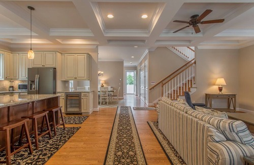 This beautiful 3,000 sq. ft. custom design and built (in 2016) luxurious beach house is our 2nd home, not a year-round rental. It was designed by noted Ocean View, DE architect Greg Hastings and built with the vacationer's comfort and convenience in mind. This house offers 5 master suites plus one additional bedroom, accommodating 16 people (max. 16 adults and 4 have to be under 100 lbs in bunk bed room) in a roomy environment. Perfect location and only 7 min. walk to the Boardwalk and Rehoboth Ave. This magnificent home has 10' coffered ceilings on the 1st floor and 9' ceilings on the 2nd floor creating a very roomy environment. Lots of oversized windows for amazing natural light. The open floor plan will allow you to cook and simultaneously entertain and interact with family and guests. This spacious 2-story home offers all the modern conveniences for a luxurious vacation; a gourmet kitchen well-stocked with World Kitchen products and quality bakeware, Wolf 6-burner gas stovetop range/oven, 2 Bosch dishwashers, 2 refrigerators and U-Line wine/beverage cooler. Dual zone central AC & heating system with 8 ceiling fans throughout the house. The dining room area can accommodate 8-10 people with additional seating at the island and bistro table in the kitchen area. The house includes 6 TVs (Smart and Roku). Living room TV has expanded cable/HD channels. High speed WiFi is also provided.