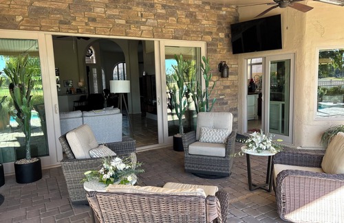 Outrageous, 2600 sq ft, custom home in SENIOR COMMUNITY OF WESTBROOK VILLAGE (Senior Community meaning 1 of the tenants must be 45 years old or older) on 5th and 1st fairway (extended fairway views - no houses directly behind) with pool and spa overlooking the course. House remodeled from top to bottom in 2015 - built for comfort, entertaining and views that don't stop. Gourmet kitchen with wolf (double oven) gas stove, sub zero, granite, over sized and high end everything!! Commercial operations with custom look - including designer dining set and 50" flat screen built in its own cabinet - slider right to the outdoor living space. HUGE family room, beautifully furnished with gas fireplace, wood shutters and over sized fan. Home office with double doors off family room with 45: TV and views to the front of the house with sounds of the water feature outside lage arched window. Dining off living room with round dining table and 6 chairs and separate from kitchen. Family room with 77" Samsung ART TV and 16 foot windows and double, over sized sliders that lead you to another, covered outdoor living space - literally the outside comes in. 2 couches, 2 chairs, coffee table with fire pit and with ceiling fans and built in outdoor heaters, and when it;s too hot, turn on the commercial misters with the touvh of a button. Large bar off family room with ice maker, beverage cooler, copper sink that also has views to outside. Over sized (everything is over sized) hallway with guest bath and leads to 2 master suites. The smaller with king bed, walk in shower (no door), separate bath (with bidet) and closet. Heated towel rack and (of course) electric outlets in medicine cabinets and drawer. Larger master with gas fireplace, beautiful king bed, dressers, footboard bench and walk in closet. Dual walk in shower and separate bath (with bidet) with door opening directly to patio and pool. Outdoor built in BBQ with fridge and large counter space. Huge covered patio with dimable lights, fans, heaters and misters. Pick your own herbs from the garden to cook in your gourmet kitchen or just enjoy the view and yard scupture. Laundry off hallway with large, samsung front load (red) steam washer and dryer and built in ironing board. Door to garage off laundry. This house is beautifully decorated with high end furniture and decor. Your family and freinds will be eager to stay. Please note: house has been updated since these photos, will update site soon and can send you photos of updates, overall house looks similar to photos but with many udpates.