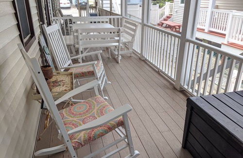 A screened in deck featuring a table that seats 8, and two rocking chairs to kick back in.