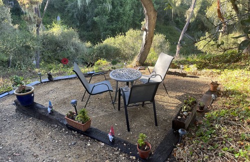 You will have full private use of this cute and comfortable downstairs 550 foot studio apt..with outdoor seating area with a beautiful view of Fiscallini ranch and creek trail. You can sit, relax and enjoy a cup of coffee or glass of wine while enjoying the beautiful view or watching an abundance of various birds, wild turkeys and on occasion deer. We are located on Park hill, one half mile walk from Shamel park and Moonstone beach. There are many walking trails close by. The unit has two twin beds that can be pushed together to make a king size bed if desired, and there is a full size pullout couch. The kitchenette has a full refrigerator, 2 burner electric hot plate, microwave, and large toaster oven, pots, pans, dishes and utensils. Living room space has a 52 inch TV. Recliner and love seat. You will need to walk down 18 steps to get to the Studio. You have access to a BBQ area upstairs in front of house as well. There is parking in front of house on the street for 1 car.
