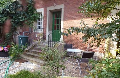 Alternatively, there is a red sofa in the living room. The kitchen with refrigerator, 2 ceramic hobs, separte oven, coffee maker, kettle and thermos for tea is fully equipped. The Küchenarpeitsplatte is made of real oak. There is a TV, radio and free Wifi connection. The floor is made of genuine Holzpackett. The bathroom is designed with granite, glass shower. The weekend Nung has two entrance doors. A door from the hallway in the house. Another garden door with access to the private terrace overlooking the garden and on the large garden pond. The apartment has been lovingly designed by an artist.
