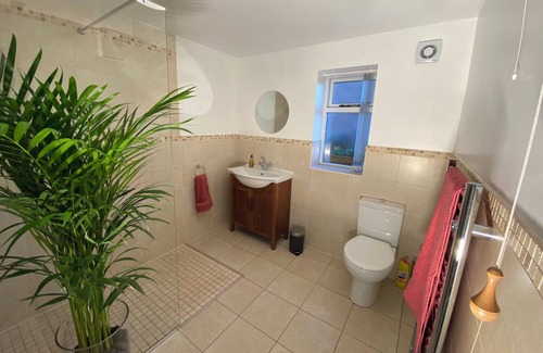 The spacious bedroom has a super king-size bed which can be separated into 2 long 3' single beds, there is a bedside table and reading light on each side. Our Super King-size bed linen is luxury 400TC Egyptian cotton. We supply a large bath sheet and bath towel per person. There is also a wardrobe, full length mirror, modern drop leaf table and chairs and an app. based, 40” flat screen television. Adjacent to the bedroom and kitchenette is a large wet-room, complete with electric shower and glass screen, a heated towel rail, vanity unit with large basin, WC and fan heater.