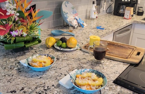 In our modern open-floor-plan fully equipped kitchen, prepare a gourmet meal and serve it up on pretty Ocean-Themed dinnerware. Or, set a table on Kona Isle's beach where you'll find 3 propane grills at waters' edge. It's the perfect spot to watch Kona’s breathtaking western sunsets; and maybe you’ll see a "Green Flash", whales breaching, or spinner dolphins playing in the surf.
