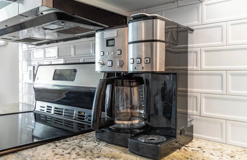 The fully-equipped kitchen has everything you need, including a Keurig and regular coffee maker, making it easy to enjoy your favorite brew during your stay. Sliding glass doors lead you to a spacious deck, perfect for sipping your morning coffee or enjoying an afternoon drink. At the end of the deck, you'll find a shared gazebo with seating, providing a relaxing spot to watch the waves.