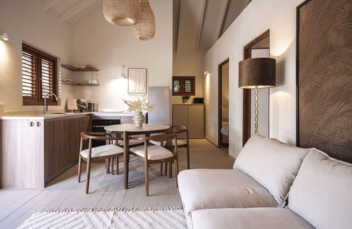 The deluxe bungalow is located on our gated resort with 9 bungalows in the beautiful nature of Westpunt with the most beautiful beaches. There is a swimming pool with cozy lounge areas and a BBQ palapa. The deluxe bungalow has a breathtaking view of the Caribbean Sea and is the only bungalow with a private pool. Also the ultimate place for a honeymoon.