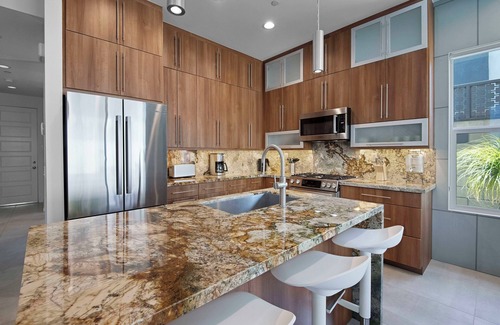 This light-filled home features soaring ceilings, designer finishes, and walls of glass that frame unforgettable views. The open-concept living room flows seamlessly into the sleek kitchen, where you'll find high-end appliances, a large island for gathering, and custom cabinetry. Whether you're preparing a casual breakfast or hosting happy hour, this space is built for connection and comfort. Just off the living room, the first floor den offers a quiet, flexible space for working remotely or enjoying a good book.