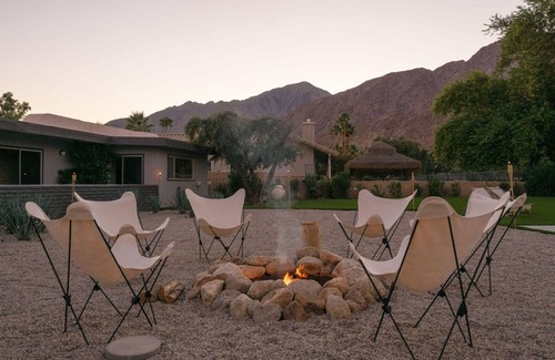 Featured in Dwell magazine, your designer mid-century modern home provides desert luxury in a tranquil residential setting. Host a breezy cookout in the palm-studded backyard, detailed with a private pool and spa, plus a dining table for alfresco meals. Then gather around the firepit and watch the stars come out.