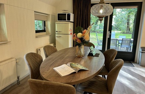 Enjoy an unforgettable holiday in the Esdorp Bungalow with Alcove Bed! This unique and comfortable bungalow is designed especially for families, accommodating 4 adults and 2 children. The cozy living room with an open kitchen is modernly furnished and features sliding or French doors that lead directly to the furnished terrace – an excellent spot to enjoy the natural surroundings.