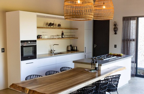 The exclusive and bright villa is fully equipped. A lot of attention has been paid to the interior and natural materials and colors have been used. Beautiful accessories bought from local craftsmen complete the whole. Of course, a kitchen island cannot be missed in a villa like this. It provides a wonderful place where you can have a drink and prepare the most delicious dishes using the extended dining table. A backup battery is recently installed to avoid South African power outages.