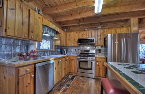 After a day of outdoor exploration, retreat indoors to your cozy mountain retreat. Curl up on the couch and unwind with your favorite shows on the large flat-screen TV, or gather around the real wood-burning fireplace for a game night with the family. The fully stocked kitchen, complete with an island, invites culinary adventures, allowing you to whip up delicious meals using fresh local ingredients, including succulent North Georgia Trout and fried apple pie from Mercier Orchards.