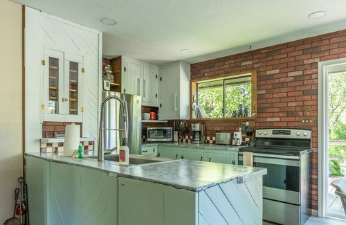 The kitchen has been beautifully updated while retaining its country charm, offering stainless steel appliances and a windowside dining table. It opens to the beautiful wraparound deck and yard, where you can dine with a mountain view and gather in the warmth of the chiminea at night.