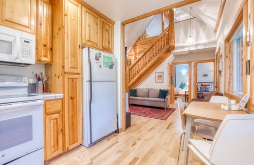 At home, start the day with a hot cup of coffee on your covered deck, overlooking the trees. Inside, you’ll find an open, airy floor plan, with vaulted ceilings, hardwood floors, pine-paneled walls, and natural-wood details. The well-equipped kitchen features a full suite of appliances and everything you need to whip up favorite recipes, and the window-front table offers a pretty mealtime view.