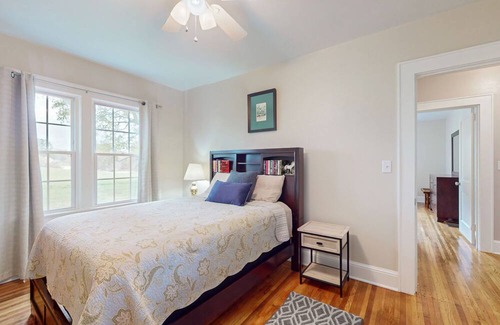 With its majestic mountain sunsets and pastoral setting, this restored 1945 farmhouse boasts modern updates and amenities for a comfortable stay. The well-equipped full kitchen for easy meal prep, an adjacent dining area for mealtimes or rainy day board games, and a comfortable living area with plush seating and a TV for streaming all your favorite channels using your own accounts. (The fireplace is not operational.)