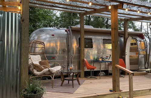 The Dream Weaver offers an unforgettable glamping experience in your private vintage 1977 Airstream! Equipped with a turntable and vinyl record collection, this Airstream is tastefully decorated with nostalgia sure to spark your best memories. It's been designed for easy outdoor living with a firepit, grill, outdoor movie screen and projector, hot tub, hammock, unforgettable private outdoor shower, Ozark Mountain views, upgraded comfortable beds, a coffee bar for modern-day comfort, and a large deck area. Take advantage of the free WiFi to stay in touch with your loved ones back home. This is truly an escape to remember!
